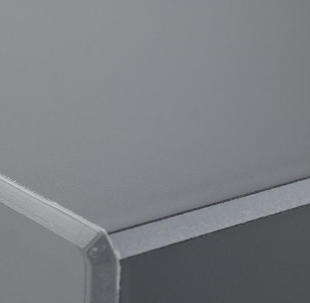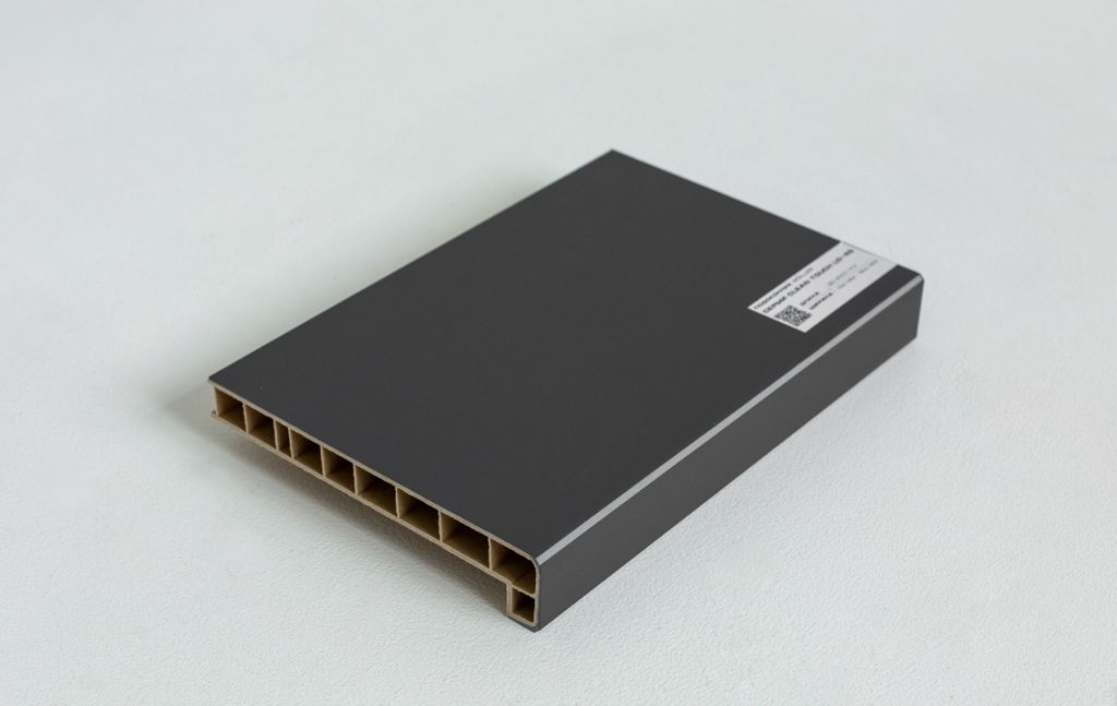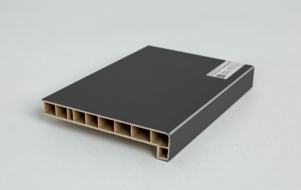 Инновационная форма с широким капиносом представлена в стильном графитовом оттенке. Передний край увеличен по высоте до 40 мм, что придает подоконнику сходство с массивной каменной плитой.